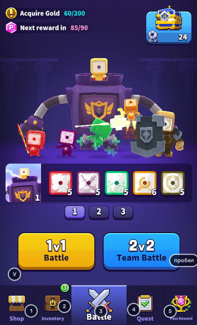 Игра на андроид от разработчиков Random Dice - 111% в стиле автобатлера. Жанр - стратегия. Игровой процесс. После прохождения обучения мы сразу же попадаем на вкладку Battle: В ней расположены 2 основных режима игры(на данный момент только они и есть): В режиме 1 на 1 игроки противостоят друг другу с помощью кубов. От места расположения кубов на доске соответственно зависит их место появления на поле (т.е. куб в 1 ряду 1 столбце на доске - юнит в 1 ряду 1 столбце на поле). Вероятность победы зависит от нескольких параметров: Основной способ получения кубов - сундук (за ключи). Открыть этот сундук можно за 40 ключей, которые добываются в игре в режиме 2 на 2. За победу можно получить 8 ключей (и 9 за перфектную победу, т.е. не получив урона по своему трону). При поражении даётся 3 ключа. В любом случае награду можно увеличить за просмотр рекламы, что дает +3 ключа к награде. Ранг. Ранги открывают доступ к новым кубам, которые могут выпасть в магазине и из сундука за ключи. Колода дл