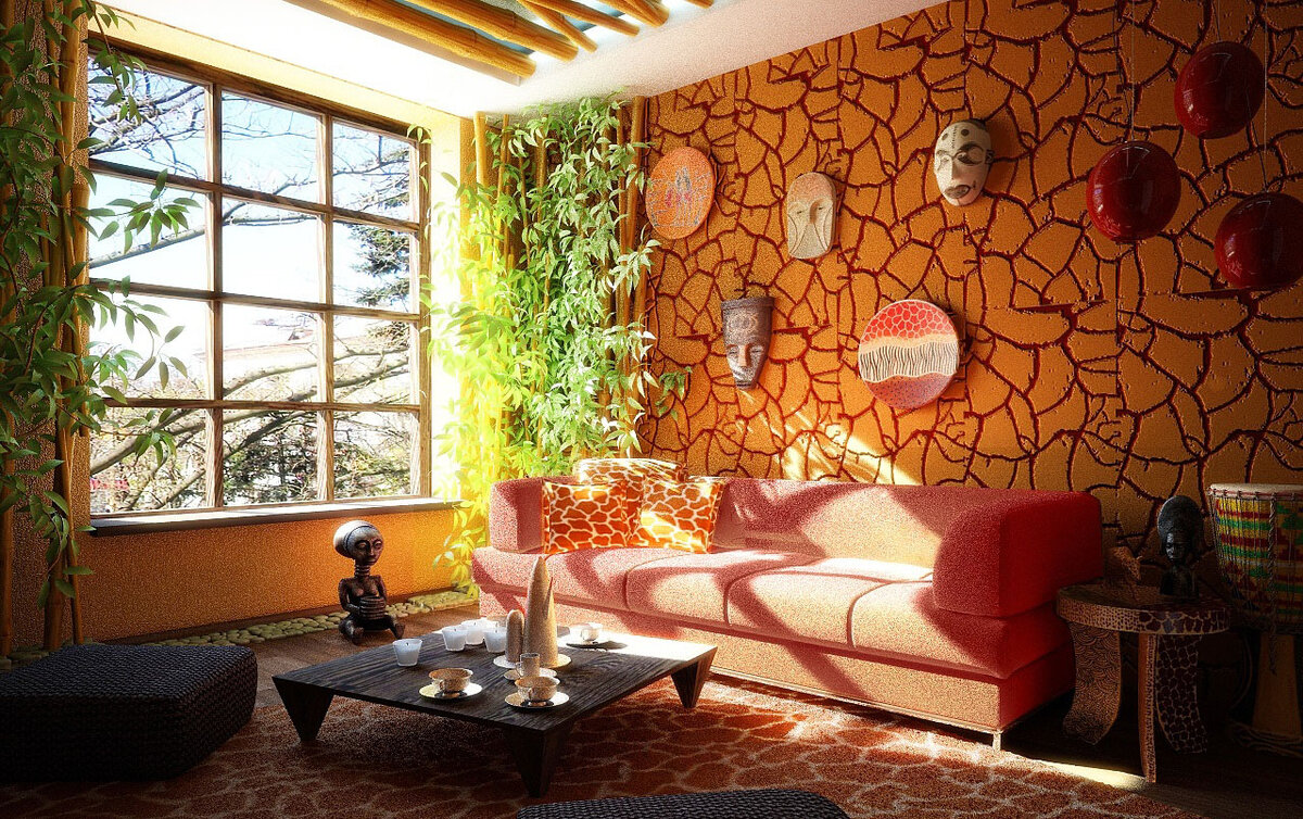 В больших городах с прямоугольными однотипными домами, прямыми улицами и серым небом нам очень хочется быть как можно ближе к природе, именно поэтому в последнее время стремительно набирает обороты этнический стиль. Он позволяет отправиться в экзотическое путешествие, не вставая с дивана, придает помещению самобытность и колорит. Этот стиль отличает насыщенность цветов, причудливо изогнутые формы, необыкновенная фактура. Этностиль При воспроизведении африканского этностиля используются исключительно экологически чистые материалы — керамика, дерево, пробка, бамбук, кожа, ротанг. Циновки на полу, керамическая посуда, плетеные кресла, глиняные горшки, бамбуковые жалюзи – такой набор поможет приблизиться к африканскому колориту. Африканский стиль в интерьере гостиной Считается, что произведенное вручную изделие хранит тепло рук мастера, обладает особой целебной энергетикой. Важно, чтобы используемые в интерьере цвета были как можно более естественными — это все оттенки коричневого и