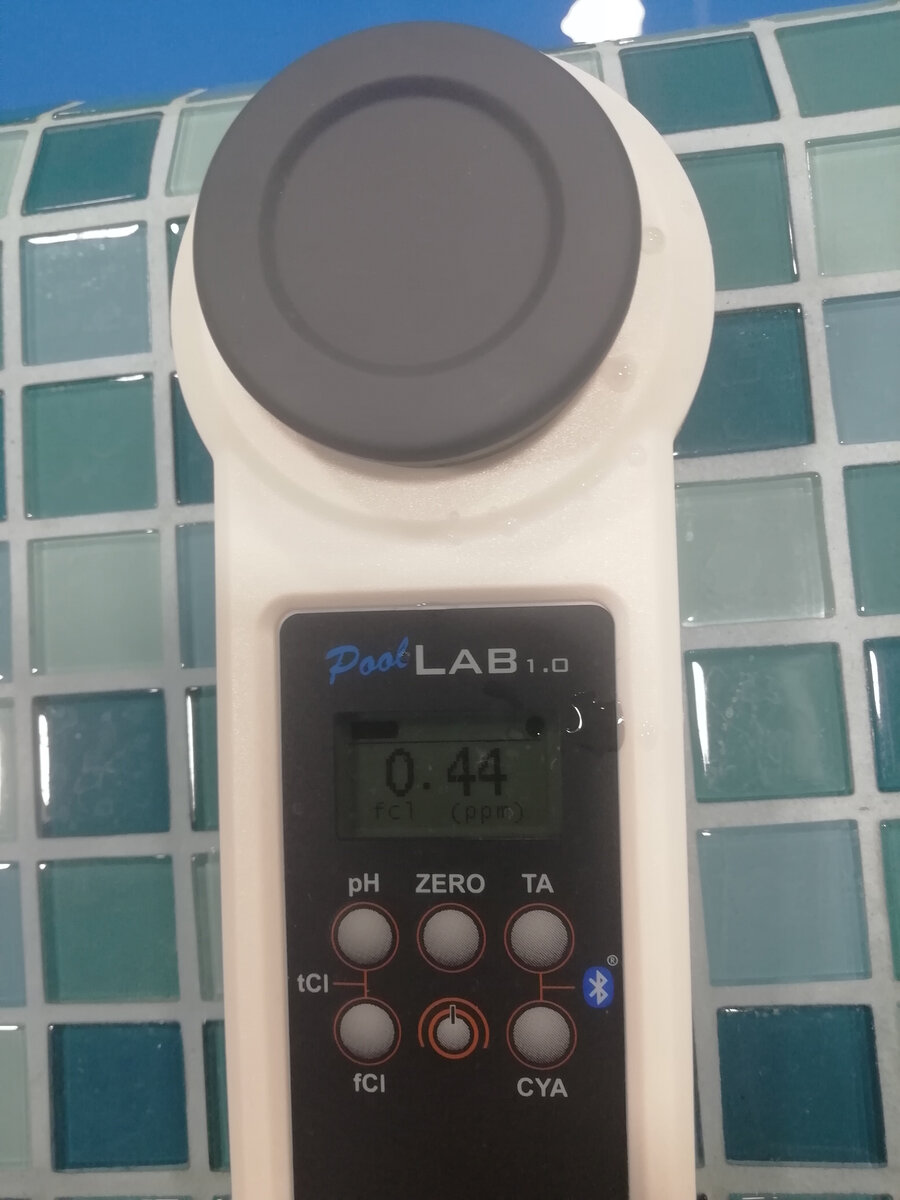 Теперь рассмотрим как это все определяется на практике. Существуют специальные приборы, которые непосредственно на месте могут определить некоторые параметры воды. В том числе свободный активный хлор. На фото выше он показывает fcl 0,44 мг/л. И это в пределах нормы.