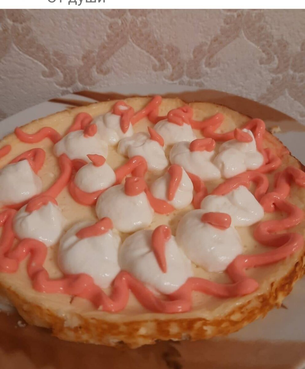 Ингредиенты: творога, яйцо, Сахар по вкусу, Крем : , Творожный сыр, Мягкий творог, Сахар Способ приготовления: Яйцо взбить с сахаром и творогом, масса получается жидкой. Выливаем в форму и запекаем при 180 ° 15 минут. Остужаем. Крем :взбиваем тв. сыр и мягкий творог с сахаром. Этим кремом и украшаем нашу запеканку.