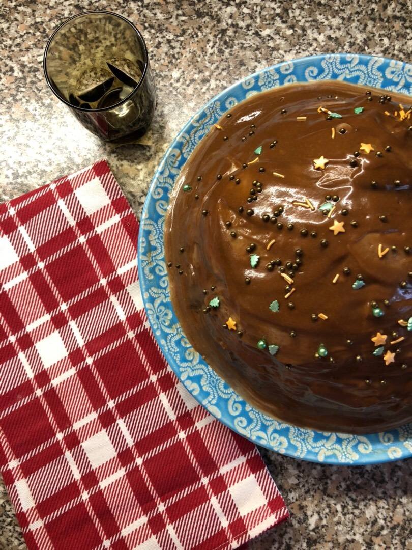 Ингредиенты: Тесто, яиц, сахара, гашеной соды, какао, муки, Крем, сливочного масла, сахара, сметаны 15%, Глазурь, сметаны, какао, сахара, сливочного масла, Посыпка (по желанию) Способ приготовления: Поставить духовку на 180 градусов. Смешать ингредиенты для теста, тесто получается жидкое. На смазанный лист чайной ложкой выкладывать тесто небольшими порциями и печь 2-3 минуты. Сливочное масло для крема растопить, добавить остальные ингредиенты. Прогреть, но недолго, чтобы сметана не отсеклась. Горячие лепёшки пропитать кремом и складывать в форме черепахи. Смешать ингредиенты для глазури и прогреть на плите пока не загустеет. Сверху полить глазурью торт (добавить посыпку по желанию).