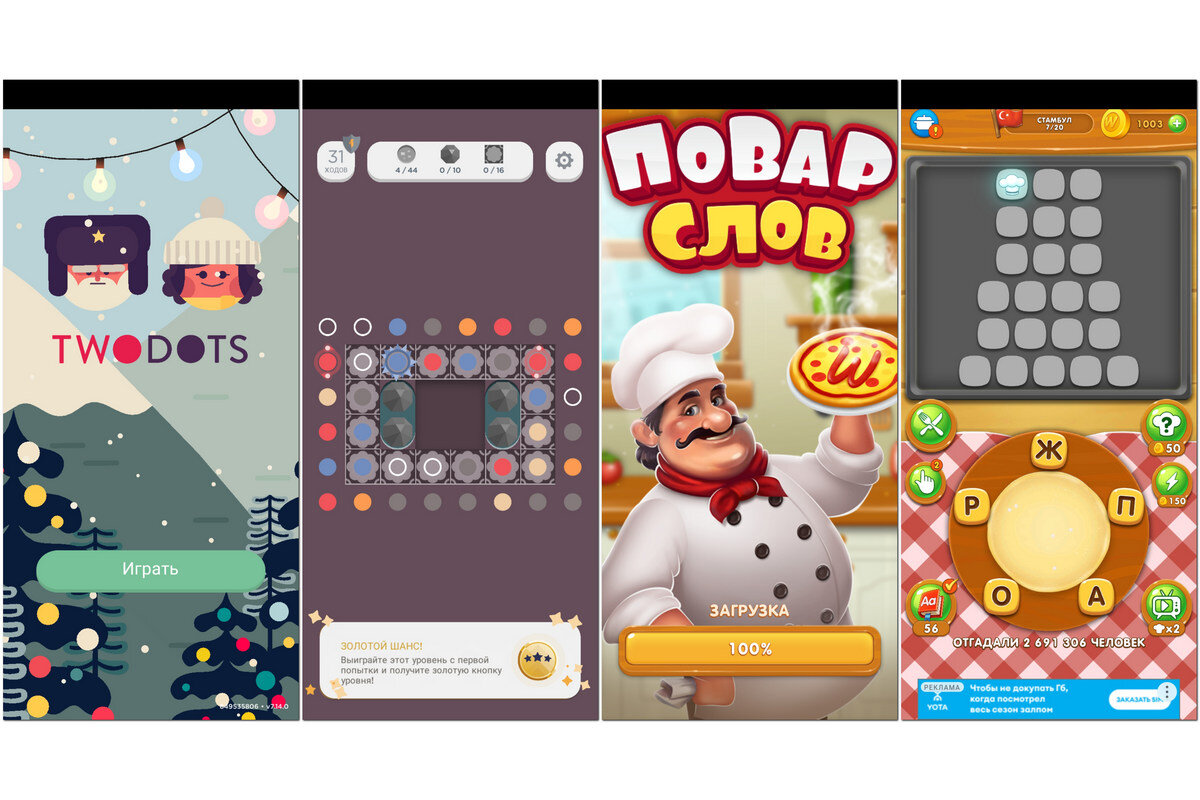 Если у вас есть важные дела, ни в коем случае не читайте этот пост! Потому что, если вы его прочитаете, есть опасность, что вместо важных дел вы будете играться круглые сутки. :) Я не играю на компьютере и приставках, а вот на телефоне, когда уже нет сил делать ничего другого, иногда играю. Четыре года назад я открыл для себя игрушку Two Dots (https://ammo1.livejournal.com/884417.html). За это время я прошёл все уровни и ещё много раз снова и снова доходил до конца, когда разработчики рисовали новые. Звучит страшно, но за четыре года я прошёл 3773 уровня. :) Прошлой осенью мне попалась ещё одна "зараза" - белорусская игра Повар слов. На самом деле подобный игр много, это одна из. Задача проста - найти загаданные слова и составить их из предложенных букв. Сначала всё просто, а потом всё сложнее и сложнее. Попробуйте найти слова на втором и третьем скриншоте (то слово, которые вы сразу нашли на первом, на самом деле не подходит :) ). Большой минус этой игры - огромное количество рекламы.