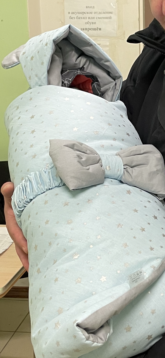 - Третий пакет на выписку который принесёт муж или другие члены семьи: мы выписывались в мороз -32. Для малыша:2 подгузника, хлопковый слип, вязанный комбинезон или флисовая поддева, носочки тёплые, носочки шерстяные, комбинезон зимний у нас был мембранный и для красоты голубой конверт с бантиком. Косметичка с косметикой для мамы, остальная одежда у меня была с собой.