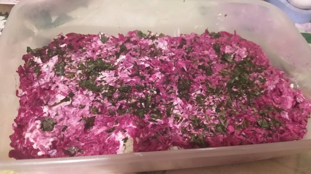 Ингредиенты: Грудка курицы, свёкла, морковь, картофель, яйцо, сыр, маленький лук, чеснок, соль, перец, Зелень, любая, Майонез или сметана для заправки Способ приготовления: Курицу, овощи, яйца отварить. Свёклу натереть на крупной тёрке, выдавить в свёклу чеснок, перемешать с майонезом и посолить по вкусу, можно поперчить. Нарезать куриное мясо на мелкие кусочки, яйца, морковь, картофель, сыр натереть на крупной тёрке и разложить по тарелкам, посолить, поперчить. Нашинковать лук. Выкладывать салат слоями, первый слой грудка курицы промазать майонезом, второй слой картофель промазать майонезом, посыпать лук, смазать майонезом, потом морковь смазать майонезом, потом сыр, потом яйца смазать майонезом и последний слой свёкла. Промазать майонезом, посыпать измельчённой зеленью и отправить в холодильник. Приятного аппетита.