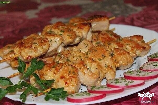 Ингредиенты: филе грудок - 700 г горчица - 1 ч.л. майонез - 2 ст.л. соевый соус - 1 ст.л. имбирь тертый - 1 ст.л. чеснок тертый - 3 зубчика Смешать все для маринада, оставить на 30-60 минут. Мясо нанизать на выдержанные в воде шпажки. Противень сбрызнуть растительным маслом и выложить мясо. Готовим минут 40 при 180-200 градусах, иногда переворачиваем. Приятного аппетита!