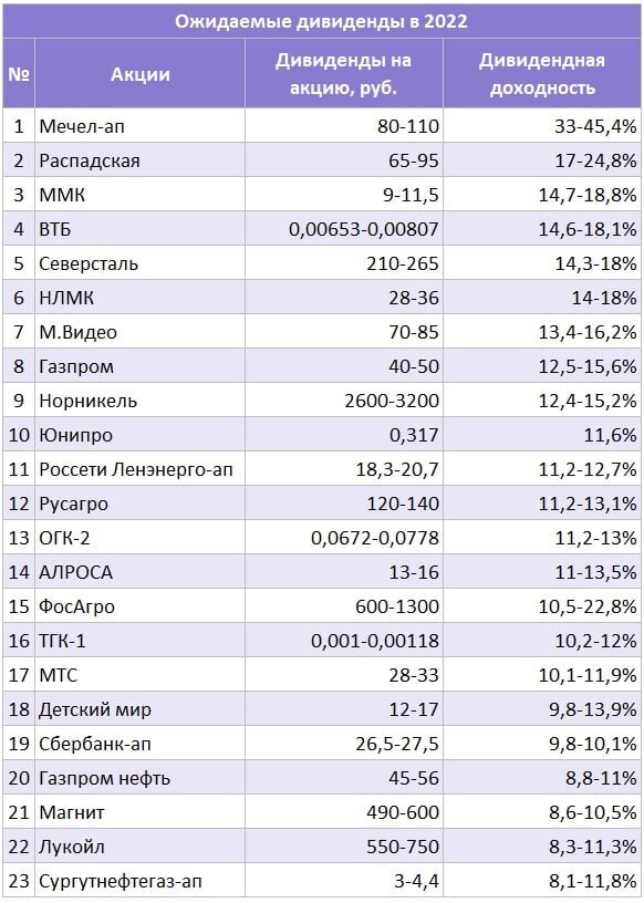 Нашел для примера табличку от БКС. Здесь представлены компании, которые предположительно могут заплатить высокие дивиденды в 2022 году. Почти у всех доходность будет от 10 процентов.