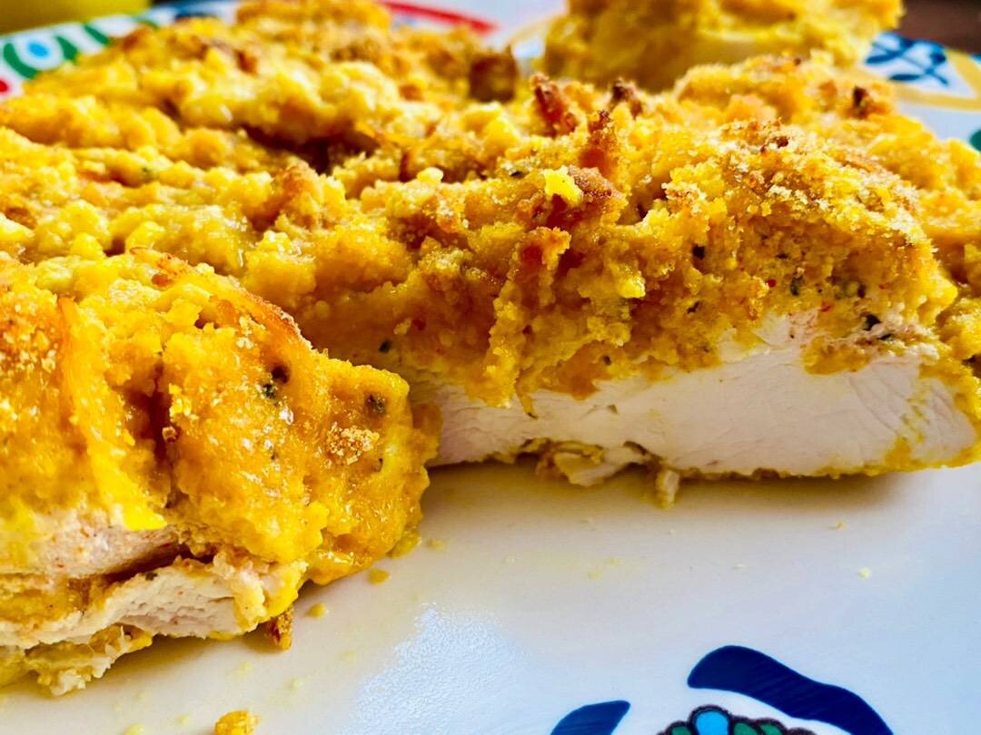 Сочная и по праздничному яркая, куриная грудка, получается в сырной панировке. Украсит любой праздник. Можно использовать любые, любимые специи. #рождество #новыйгод Ингредиенты: целая куриная грудка (4 половинки), сметана (или кефир, или йогурт), сухой чеснок, паприка копченая, чёрный молотый перец, соль, панировочный сухари, сыр натёртый на мелкой тёрке, куркума, базилик сухой Способ приготовления: В каждой куриной грудке, из двух половинок, сделать острым ножом надрезы, прорезая не до конца. Немного посолить. В сметану добавить специи и немного соли. Хорошо перемешать и залить курицу. Так чтобы заливка попала во все прорези. Дать полежать минимум полчаса, но лучше дольше. Можно и на ночь оставить. Приготовить панировку. В панировочные сухари добавить куркуму, сухой базилик, сухой чеснок и сыр. Каждую куриную грудку обсыпать панировкой очень качественно, проникая в разрезы, со всех сторон. Разогреть духовку до 180 градусов. Выложить грудки в форму для запекания. Запекать полчаса. Но