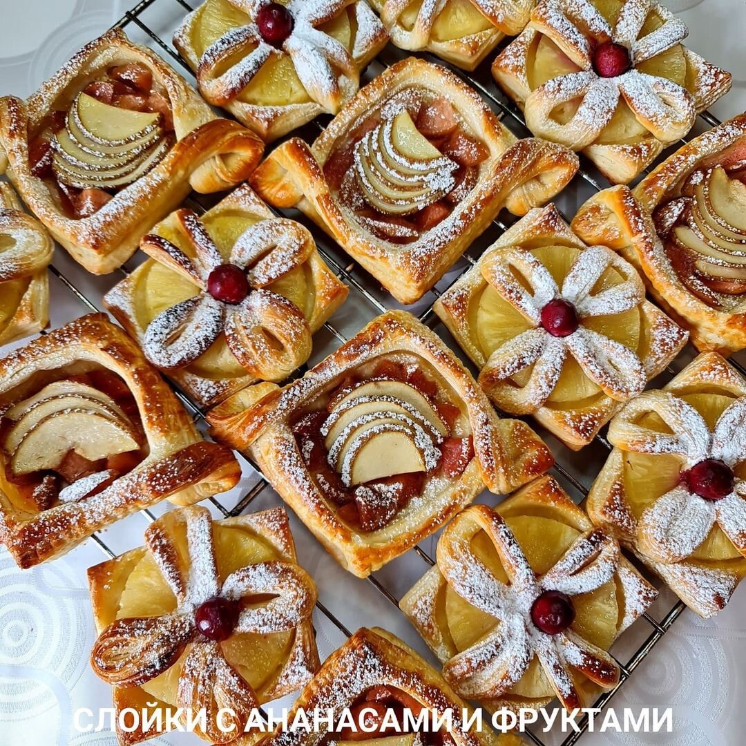 Быстрая выпечка к чаю всегда актуальна! Слойки с ананасами и фруктами готовятся быстро и очень просто. Из данного количества ингредиентов у меня получилось 10 слоек с ананасами и 8 слоек с яблоками и грушами