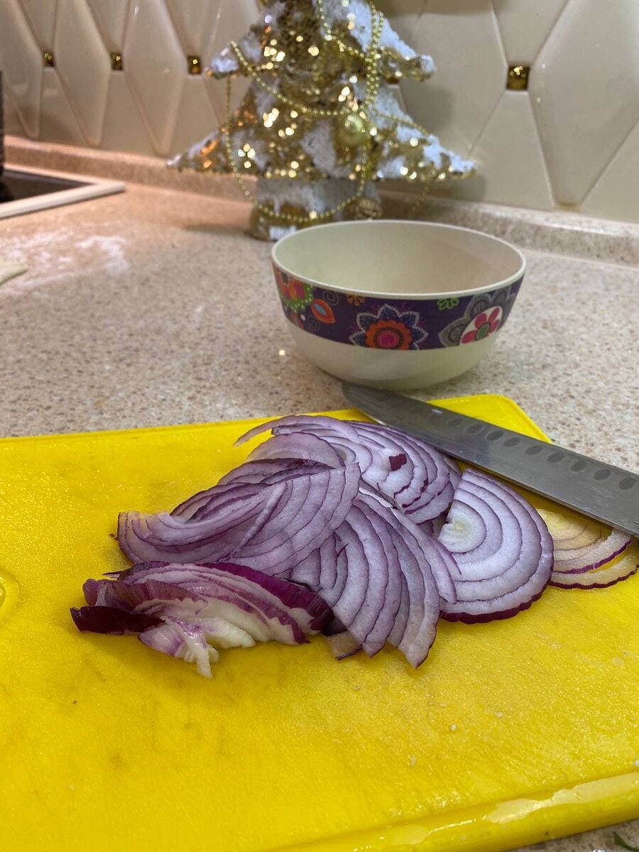 1. Нарезаем полукольцами лук. Кладем в миску и маринуем. Для этого понадобится соль, уксус, у меня был яблочный и сахар. Все это мнем и убираем в сторонку.