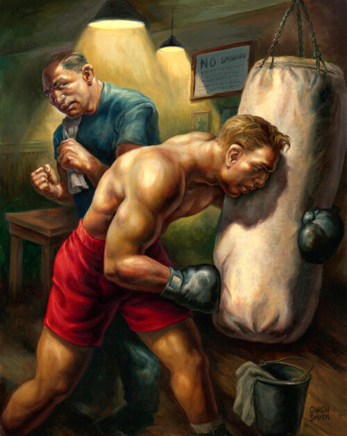 Но беда автора в том, что произнося слово, кулачный бой, он забывает, что именно при такой подаче головы, как он показывает, он упадет сразу и безоговорочно в нокаут.