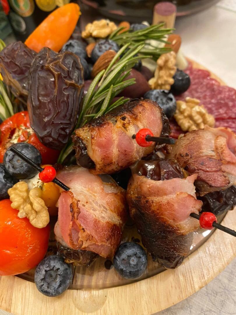 Вкусная закуска Ингредиенты: Финики, Сыр бри, Бекон Способ приготовления: У финика достать косточку, внутрь положить кусочек сыра бри. Завернуть в бекон и обжарить или запечь.