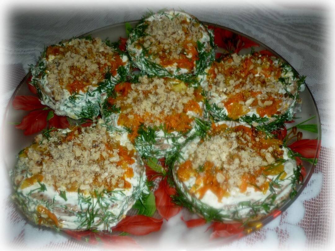 #новыйгод Красивая и вкусная закуска на праздничный стол. Ингредиенты: куриной печени, яйца, молока, муки, соль, перец , растительное масло для жарки, Для начинки:, средних моркови, репчатый лук среднего размера, майонеза, свежий укроп, чеснока Способ приготовления: Печень почистить от желчных протоков, помыть, прокрутить на мясорубке или блендере до однородной массы. Добавить яйца, соль, перец, молоко, просеянную муку, хорошо перемешать. Дать тесту постоять минут 10. Испечь блинчики на смазанной маслом сковороде. У меня получилось 12 тонких блинчиков. Формочкой вырезать заготовки для нашей закуски. Для начинки лук почистить и порезать мелкими кубиками. Морковь натереть на средней на тёрке. Обжарить лук и морковь до готовности. Остудить. В майонез добавить порезанный укроп и натёртый чеснок. Собираем закуску. Кружочки смазать майонезом,выложить морковь с луком, так несколько слоёв. Укладываем на блюдо и украшаем по желанию. У меня укроп и грецкие орехи. Приятного аппетита!
