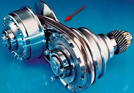 Основным элементом клиноременной передачи можно назвать зубчатый ремень с формой поперечного сечения в виде трапеции. Некоторые заводы используют ремень или цепь из металлических пластин. Еще одним компонентом являются два шкива, образованные коническими дисками, способными изменять диаметр. Это позволяет изменять скорость и величину передаваемого крутящего момента.