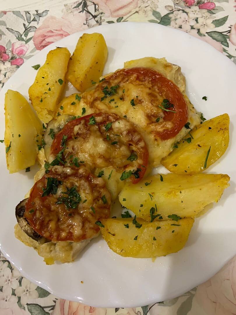 Ингредиенты: филе индейки, шампиньоны, помидор, сыр твёрдый, сметаны или майонеза, горчицы слабо острой, Специи, картофеля, сухой приправы для румяного картофеля с Магги, растительного масла Способ приготовления: Филе индейки моем, просушиваем бумажным полотенцем, помещаем в полиэтиленовый мешочек и отбиваем с двух сторон. На отбивные кладём майонез и горчицу, равномерно смешиваем и распределяем по мясу, солим, перчим по вкусу, сверху добавляем нарезанные пластинами грибы. Затем нарезанные пластинами помидоры, посыпаем тёртым сыром. Заранее слегка отвариваем нарезанный дольками картофель, остужаем, смешиваем со смесью и растительным маслом и укладываем вокруг индейки. Отправляем в разогретую до 180 градусов духовку на 25-30 минут. При подачи посыпаем зеленью. Приятного аппетита!