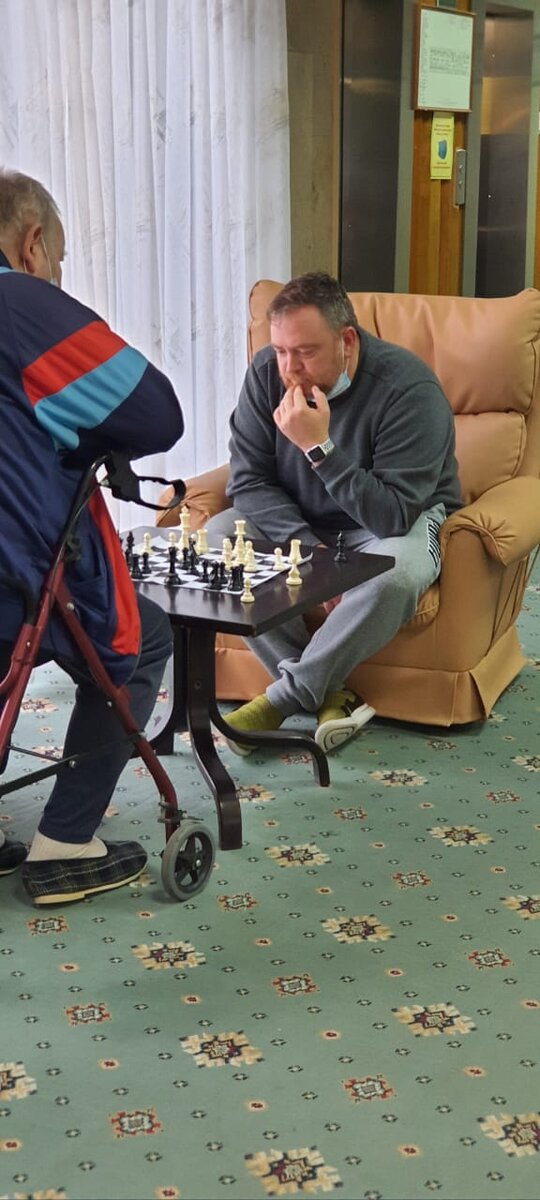 Первый раз увидел этого дедушку в столовой. Жена кормила его с ложечки, а сильный тремор не позволял ему даже кусок хлеба донести до рта. Потом много раз видел его в лобби. Сидит в застывшей позе и смотрит на расставленные шахматные фигуры. Казалось, мысленно разыгрывает партии: яркие шахматные баталии с полностью неподвижными фигурами. Сегодня, проходя мимо дедушки, я на секунду замешкался и услышал его ровный спокойный голос: «В шахматы играете?» Соврать, что «Нет» язык не повернулся. Тем более, что до следующей процедуры ещё оставалось время. Решил сыграть. Мои любимые белые стояли аккуратно расставленные и приглашали ходить. Сходил... раз, два, три... куда-то делась пешка, потом слон, размен ферзями, не помню, как проворонил ладью... ходов через несколько получил линейный мат двумя ладьями! ХМ. Реванш. Дедушка сжалился и начал подсказывать мне, показывая трясущимся пальцем на мои явные косяки. Не помогло. Второй мат случился ещё быстрее первого. Уходил с грустью, но не потому ч