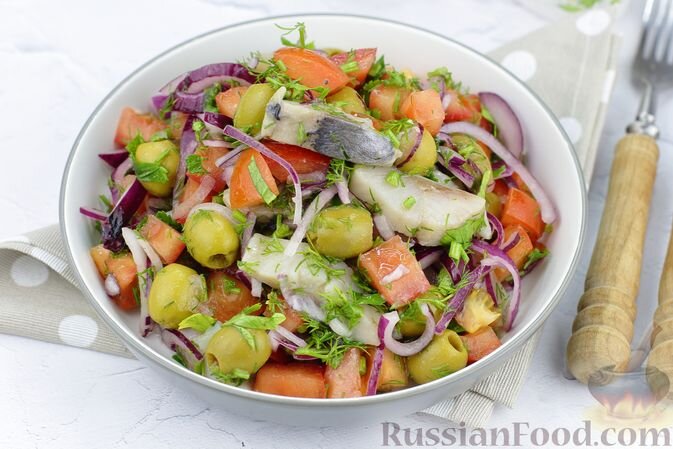 Салат с сельдью, помидорами и оливками. Салат с морковью, мандаринами и яблоком. Салат из яиц и маринованного лука. Салат с тунцом и сыром. Салат с сельдереем, яблоком и сметаной. Салат с крабовыми палочками, капустой, кукурузой и огурцом. Салат из капусты, моркови и яблока, с соевым соусом. Яркий, сочный, витаминный салат с морковью, мандаринами, яблоком и грецкими орехами. Все продукты для его приготовления используются в свежем виде. Морковь и яблоко нарезаются соломкой, соединяются с кусочками сочного мандарина и хрустящими грецкими орехами. Заправляется салат растительным маслом и лимонным соком. Салат из яиц, маринованного лука и зелени - максимально простое и недорогое блюдо с насыщенным вкусом. Аппетитный хруст лука и нежность отварных яиц - прекрасное сочетание. Готовится салат быстро, съедается ещё быстрее. Этот салат отлично подойдёт и в качестве закуски к определённым напиткам.) Салат с тунцом, сыром, яйцами и оливками. Все ингредиенты отлично гармонируют и дополняют друг