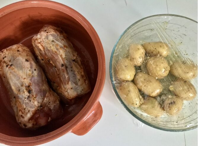 Жареная рулька – очень вкусное мясо. Принято считать, что рулька — это жирный кусок мяса, и ее лучше избегать в ежедневном рационе. В быту да, но время от времени в зимнее время года, я думаю, что его нужно есть. В рецепте ниже я использую переднюю часть рульки без кожи. И вкус такой, каким он должен быть. Так что готовьте с умом, не переусердствуйте с тяжелыми блюдами, но на одних нежирных йогуртах долго не протянете. Особенно зимой. Нам понадобится: Подготовьте все ингредиенты. Картофель моем под проточной водой, а затем хорошо обсушиваем. Маринуем мясо простым способом. Для маринада нужно три столовых ложки оливкового масла, лимонный сок одного лимона, отставить настояться. Посыпьте свиную рульку солью, перцем и любой приправой на ваш вкус. Выложить приправленную свиную рульку в жаропрочную посуду, а затем влить в нее чашку воды. Накрываем посуду крышкой и затем запекаем мясо в разогретой до 200 градусов Цельсия духовке 1,5 часа. По истечении указанного выше времени достаньте кастр