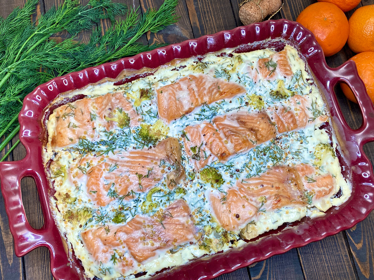 Сегодня у нас потрясающе вкусный лосось с картофелем и брокколи, запечённый под нежным сметанным соусом! Это блюдо отлично подойдет для особого семейного ужина или праздничного застолья, а также очень понравится детям. Ингредиенты: Форель (речная) - 500 гр Картофель - 1 кг Сметана 20% - 300 гр Сливки - 200 гр Брокколи - 1/4 шт Горчица зерновая - 1 ст.л Сок лимона - 1 ч.л Растительное масло - 1 ст.л Соль, черный молоты перец - по вкусу Свежий укроп Приготовление: Шаг 1. Первым делом подготовьте картофель. Его необходимо вымыть, очистить от кожуры и нарезать небольшими кубиками. Шаг 2. Подготовленный картофель посолите, поперчите и переложите в глубокую форму смазанную небольшим количеством растительного масла. Отправьте запекаться в разогретую духовку при t 200 гр. минут на 20 -25 до полной готовности картофеля. Шаг 3. Тем временем подготовьте рыбу. Хорошо промойте в холодной воде и отделите филе лосося от кожи, костей и плавников. Шаг 4. Подготовленное филе обсушите бумажным полоте
