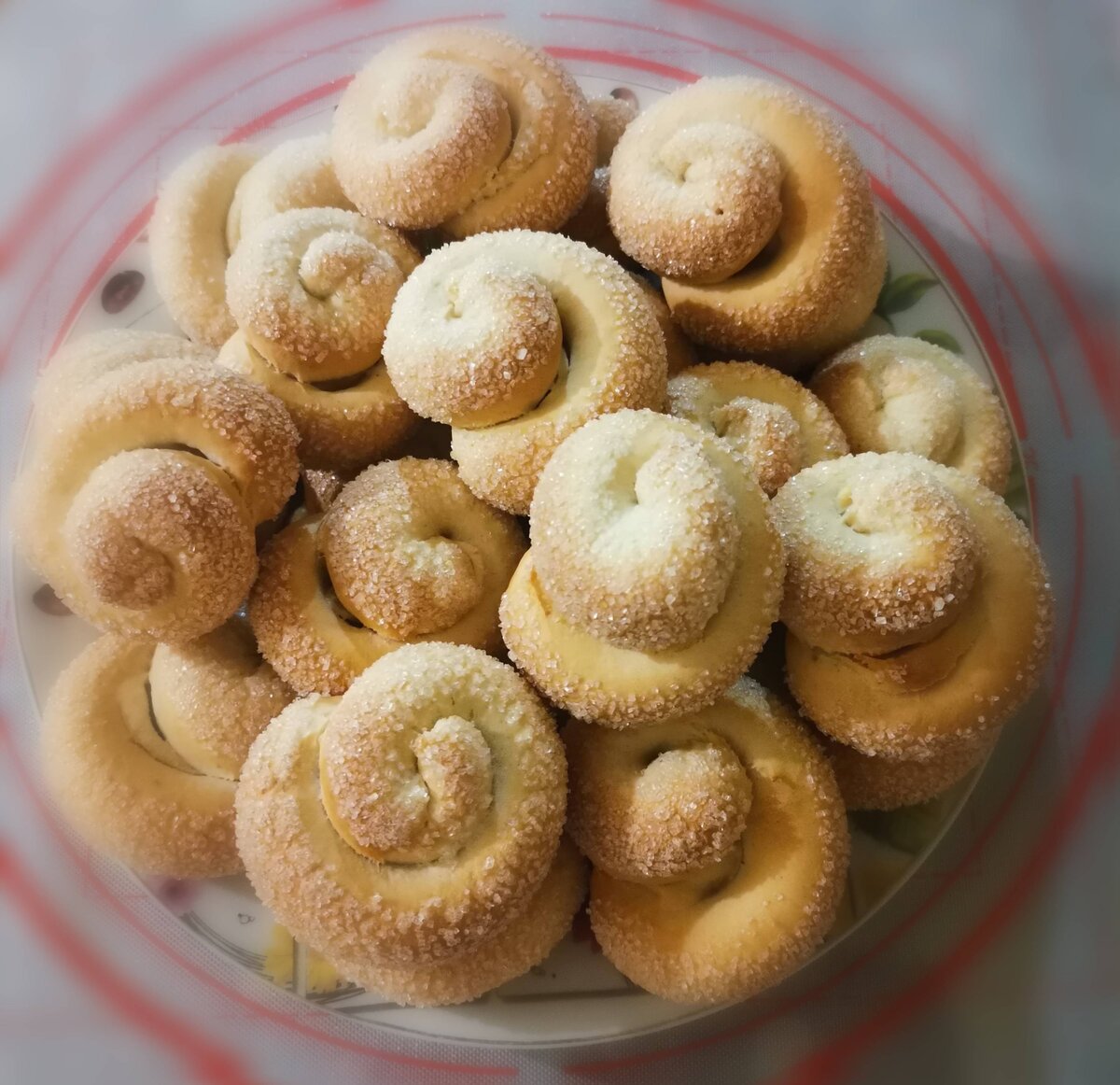 Оно получается вкусное, ароматное и слоистое. Такая выпечка всегда дополнит и украсит ваше чаепитие. #быстро Ингредиенты: кефир (2,5%), яйцо, соль, сахар , масло растительное, разрыхлитель , мука, Для посыпки, сахара Способ приготовления: В миску выливаем 150 мл кефира комнатной температуры (у меня жирностью 2,5%), вбиваем 1 яйцо, добавляем щепотку соли, высыпаем 3 ст.л. сахара и добавляем 70 мл растительного масла без запаха. Хорошо перемешиваем венчиком до однородности. Теперь в тесто высыпаем 1 ч.л. разрыхлителя и в 2 приёма добавляем 380 г просеянной муки. Замешиваем тесто. Когда тесто собралось в единый комок – переходим работать на стол. Вымешиваем тесто до гладкого и эластичного состояния. Оно мягкое и не липнущее к пальцам должно быть. Разделяем тесто на 2 части, каждую из которых делим ещё на две половины и каждую такую половинку делим ещё на 4 - 6 кусочков. Стараемся, чтобы все кусочки были одинакового размера. Чтобы тесто не заветривалось накрываем его пакетом, берём одну ча