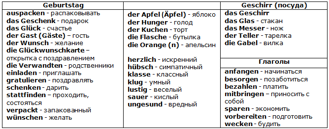В данном уроке мы выучим слова по теме Вечеринка и День Рождения и выполним много интересных упражнений. Упражнение 1. Запишите слова в словарь с переводом. Упражнение 2. Запишите слова на картинках. Упражнение 3. Сопоставьте слово и перевод. Упражнение 4. Сопоставьте слово и перевод. Упражнение 5. Напишите, что хочет получить мальчик на День рождения? Например: Er will ein Ball bekommen.