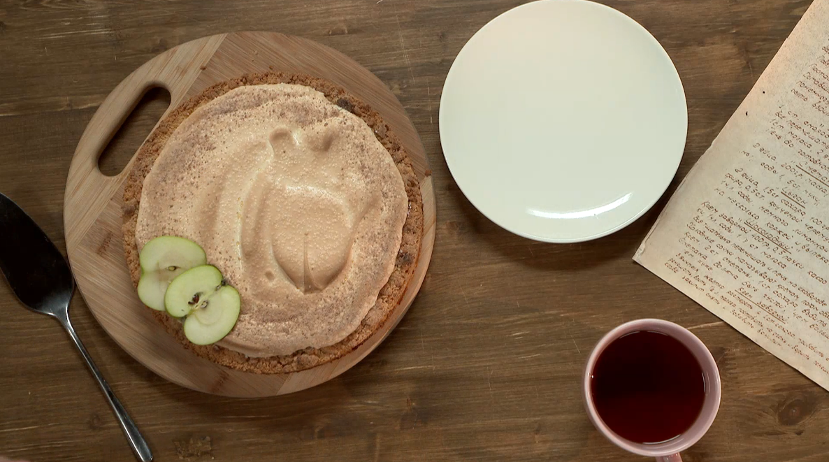 молотая корица Способ приготовления 1. Отделяем белки от желтков. К желткам добавляем сметану, сливочное масло, сахар, соль, соду, ванилин, начинаем замешивать руками и поэтапно вводим муку, продолжаем тесто замешивать, перетирая его руками. Тесто должно получится в виде крошки. 2. Яблоки очищаем и натираем на крупной тёрке, добавляем тростниковый сахар и всё перемешиваем. 3. Форму для выпекания можно застелить пергаментом, на дно формы выкладываем часть теста, примерно половину, разравниваем и слегка приминаем, тесто на края формы не заводим. Выкладываем на тесто яблочную начинку и выравниваем, сверху на начинку - тесто, стараясь выдерживать слои одинаковой высоты. Ставим выпекаться пирог в духовку, разогретую до 180 градусов, на 30-40 минут. 4. Для декора готовим меренгу. Взбиваем белки и добавляем сахар. 5. Белковой массой покрываем пирог, не закрывая полностью весь периметр. Ставим пирог еще раз в духовку, нагретую до 200 градусов, приблизительно на 10-15 минут, до того момента, ка