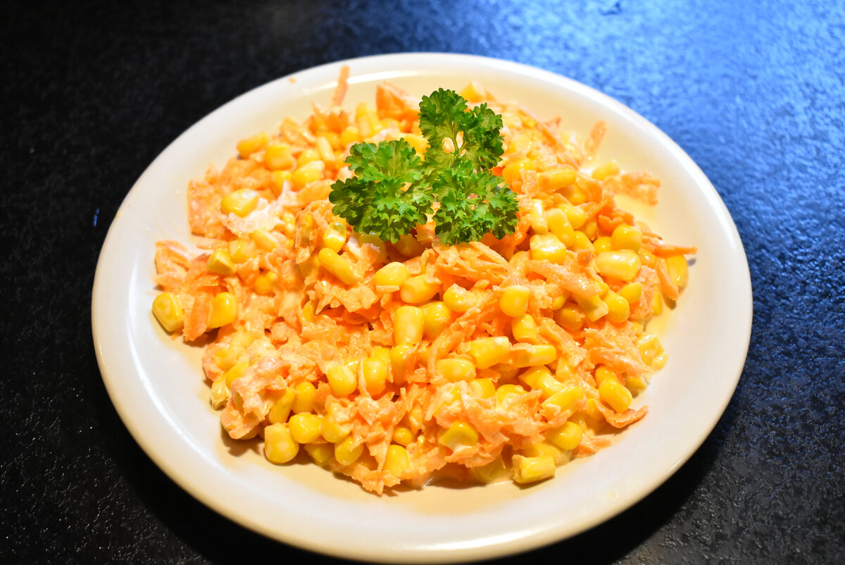 Раньше я думала, чтобы приготовить вкусный салат, для него нужно обязательно много разных продуктов. Но я ошибалась, ведь приготовить его можно даже из трех ингредиентов. И самое интересное, что он будет ничем не хуже, чем всякие навороченные салаты. Сегодня хочу поделиться с Вами самым бюджетным салатом, который подойдет на все случаи жизни. Я его всегда называю Простой салат. Он нравится не только моей семье, но и гостям. Он отлично разнообразит Ваш стол на праздник, потому что среди салатов в состав которых входит много продуктов, должно быть что-то простое, но в то же время вкусно. Обязательно советую приготовить! 👨🍳 Давайте уже готовить! Список продуктов я оставлю в конце статьи, для Вашего удобства. 3 средних очищенных моркови натираем на крупной терке. Если дома есть специальная терка для моркови по-корейски тогда можете использовать ее. Я натираю морковь сразу в глубокую миску. К моркови всыпаем 1 баночку консервированной кукурузы. Пропускаем 3 зубчика чеснока через пресс.