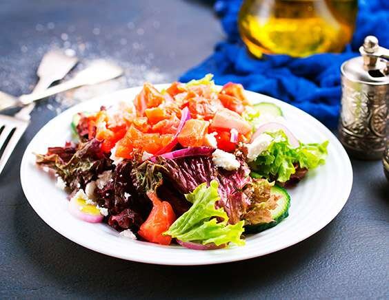 Салат с семгой Семга слабосоленая - 150 граммов Огурец - 1 штука Помидоры - 200 граммов Красный лук - 1 штука Смесь салатов - 100 граммов Фета - 70 граммов Оливковое масло - 5 ст.л. Вода - 3 ст.л. MAGGI® Приправа Весенняя зелень - 1 ст. л. 1. Для приготовления вкусного и легкого салата с семгой понадобятся следующие ингредиенты: кусочек семги слабосоленой, огурец, помидоры, красный лук, салатный микс, сыр фета, оливковое масло и MAGGI® Приправа Весенняя зелень. 2. Упаковку готовых салатных листьев выложить на сервировочное блюдо. 3. Овощи промыть в прохладной воде, обсушить с помощью бумажных салфеток и нарезать. Лук очистить от кожицы и нашинковать полукольцами. Соединить овощи с салатными листьями. 4. Филе слабосоленой семги нарезать тонкими ломтиками и разложить на салатные листья. 5. Для заправки в отдельной емкости смешать MAGGI® Приправа Весенняя зелень с 3 ст.л. горячей воды и дать постоять 5 минут. Затем добавить 5 ст.л. оливкового масла и тщательно перемешать. Полученной смесь