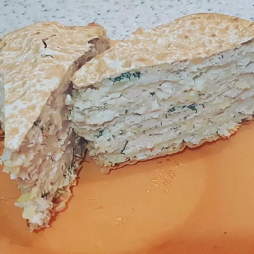 Ингредиенты: круглый лаваш, картофель, сыр, зелень, йогурт, чеснока, приправа, куриный фарш Способ приготовления: Смешать фарш с мелко тёртым картофелем, добавить йогурт, натёртый сыр, зелень, мелко измельченный чеснок, приправу. Всё хорошо перемешать. Каждый слой лаваша смазать начинкой, верхний слой накрываем лавашем, запекаем в разогретой духовке в течение 30 минут при 180°. ⠀