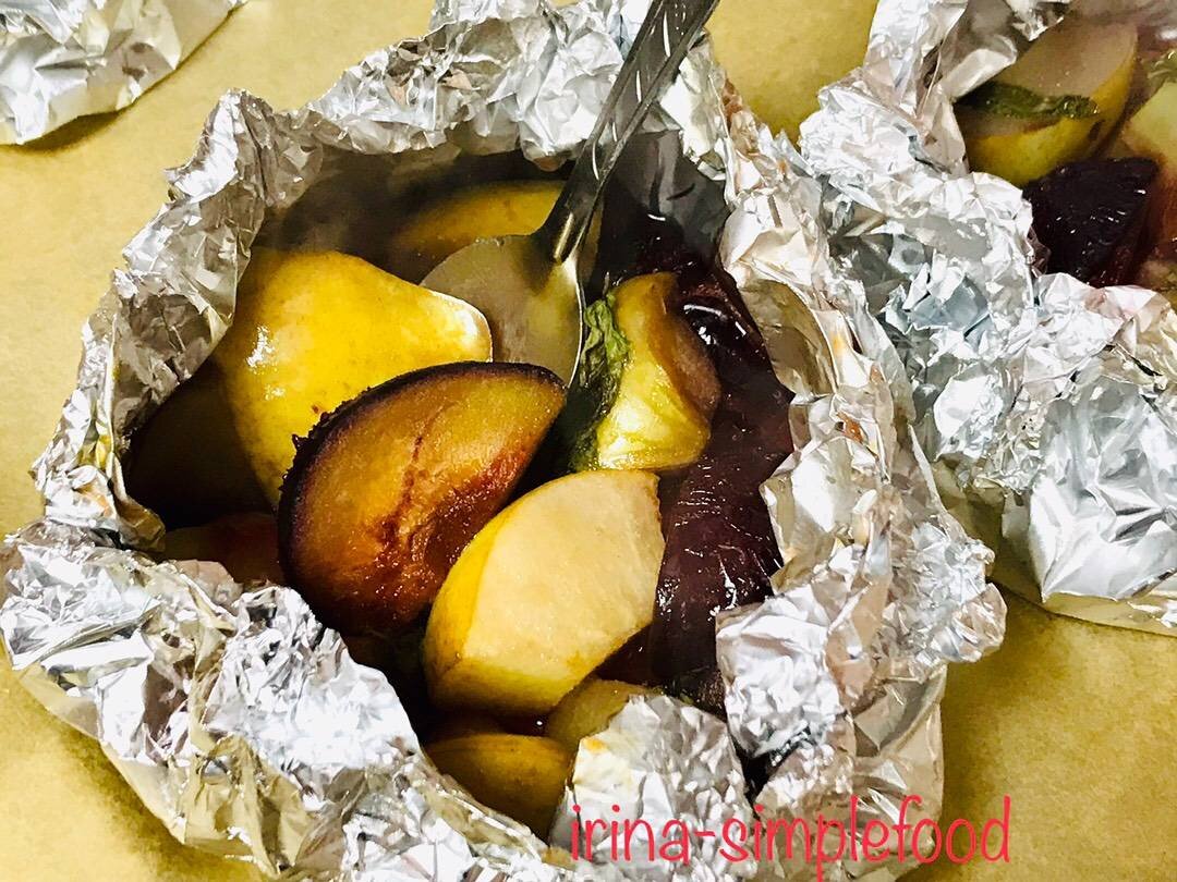 #быстро #десерт Очень вкусный десерт, можно приготовить из любых фруктов, а если по готовности добавить ложечку бальзама, так вообще фантастика. Ингредиенты: яблока, груши, крупных сливы, коричневого сахара, мёда, мяты Способ приготовления: Фрукты помыть, из яблок и груш удалить сердцевину, из слив косточку, нарезать все средними кусочками, перемешать. Из плотной фольги вырезать 4 квадрата, разложить равномерно фрукты, добавить листики мяты, сахар и мёд. Собрать фольгу так, чтобы получился мешочек. Выложить на противень покрытый пергаментом и запекать в духовке разогретой до 250 ‘С 15 минут. При подаче можно влить по столовой ложечке бальзама, это придаст особый вкус. Приятного аппетита 😋.