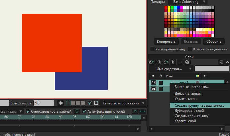 Маска - это важный элемент в moho. С помощью маски в можно спрятать некую часть объекта, но это конечно же не всё. Сегодня рассмотрим только основные функции маски. Итак, для того чтобы пользоваться масками, необходимо иметь хотя бы два слоя в группе. Для начала нужно создать два векторных слоя фигурами. Затем выделить их, нажать ПКМ и выбрать пункт "Создать группу из выделенного": После этого появится группа, внутри которой будет два наших слоя. Далее открываем параметры слоя (группового слоя), дважды кликнув по нему и ищем пункт "Маска": Здесь есть три пункта: "Нет маски в этой группе", "Показывать все", "Скрывать все". В первом случае всё остаётся как было. Если нажать на второй пункт (Показывать все), то нижний слой будет маскировать собой верхний слой: То есть нижний слой вычитает своей фигурой всё то, что в верхнем слою. Если же поставить пункт "Скрывать все", то верхний слой будет маскироваться, за пределами нижнего (будет видена та часть, которая находится внутри нижнего слоя)