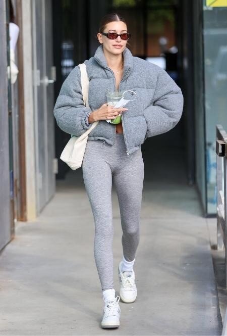 Многие звездные инфлюенсеры стараются вносить больше красок в свой спортивный гардероб и делать походы на тренировки более жизнерадостными. Но некоторые из них добиваются стильных решений и с помощью привычной базовой палитры оттенков. Особенной популярностью в последнее время пользуется серый и его вариации, ярким адептом которых уже стала Хейли Бибер. Для похода на спорт звезда подбирает аутфит с леггинсами, дутой курткой и спортивным бра в тотальном сером, дополняя лук темными солнцезащитными очками, светлой сумкой-шоппером и белыми кроссовками с высокими носками. Текст: MarieClaire.ru #хейли бибер #звездный стиль #мода #стиль