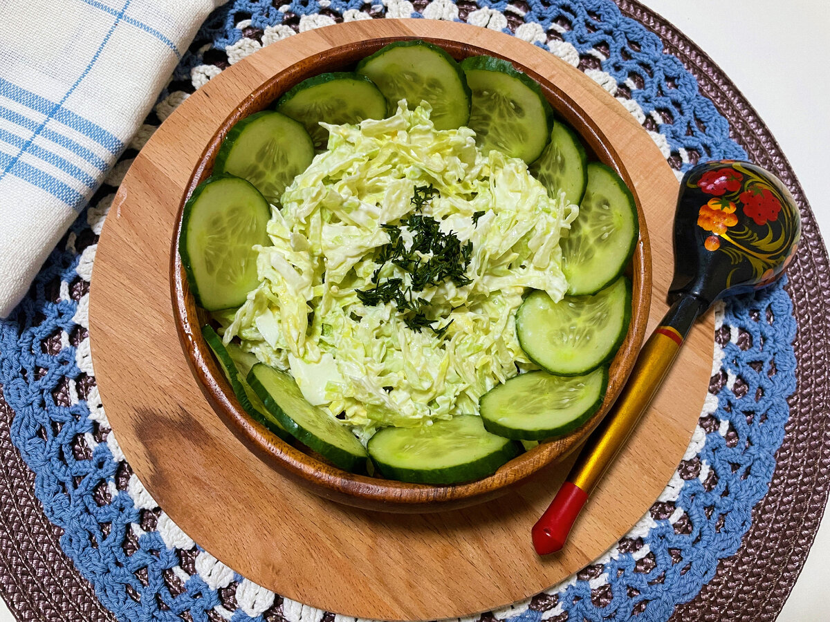 Сочный, легкий и с кислинкой, такой салат готовлю в любое время года. Приготовление занимает мало времени, если в доме есть вареное куриное яйцо:). Почему, если есть? Можно же сварить! Все дело в том, что однажды я заглянула в свою любимую книгу «О вкусной и здоровой пище» от 1954 года и открыв раздел «Салаты» стала искать какой-нибудь легкий и простой рецепт. Было лето, взглянув в холодильник, увидела там овощи и одиноко лежащее на тарелке вчерашнее куриное яйцо, оставшееся после завтрака. Вот его то и надо было пристроить в салат и, рецепт нашелся! Предлагаю приготовить изумительно легкий и вкусный «Салат со сметаной и яйцом», именно так он и называется. Для салата шинкуем тонкой соломкой 300 г зеленого салата, у меня «Айсберг» и отправляем его в блюдо. Теперь наливаем в отдельную емкость 0,5 стакана сметаны и добавляем к ней скучающее куриное яйцо (у меня вчерашнее, у вас может быть утрешнее, да можно и сварить лишнее, в конце концов)) Готовим соус, добавив к нарезанному куриному я
