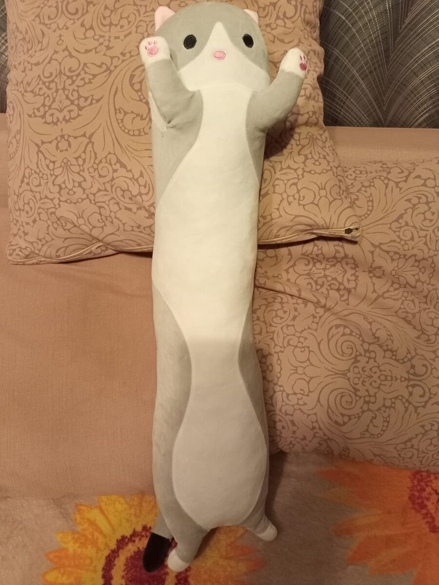 На днях был день рождение младшей дочери -8 лет. Подруга с садика подарила ей кота-батона. Котик двухцветный-серый с белым с черными пятнами на спине. Его отличительная черта-длина всего тела составляет 70 см, его удобно носить на руках детям, спять в обнимку, а можно использовать в виде подушки под голову. Материал на ощупь очень мягкий. Качество пошива достойное, выполнено на высшем уровне, качественно прошиты глазки, нос, ушки и другие детали, посторонних запахов не имеет. На голове имеется небольшая молния, можно расстегнуть ее и посмотреть содержимое. Котик понравился не только младшей дочери, но и старшей, которой 12 лет. Поэтому пока младшей нет, старшая забирает его к себе. На дне рождения игрушка приковала внимание к себе всех детей, даже той девочки, которая подарила. Она заявила, что непременно попросит маму, что бы она тоже купила такого кота.))) Если Вы собираетесь на день рождение и не знаете,что подарить, то этот кот отличное решение. Все будут в восторге и не только