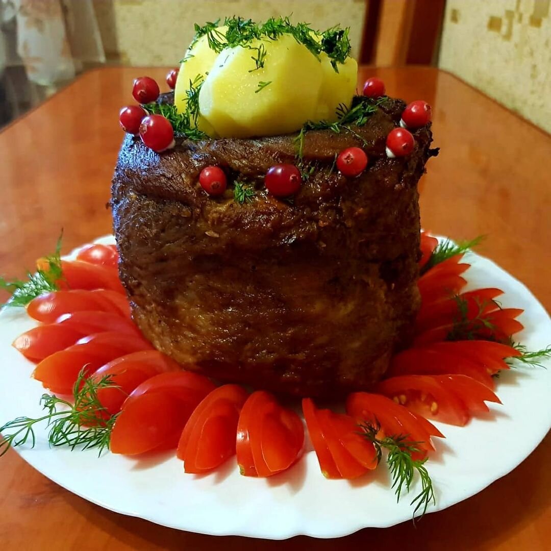 Готовые рёбра достаём из духовки, убираем кольцо, кладём в середину отварной картофель. Украшаем свежими помидорами и укропом.