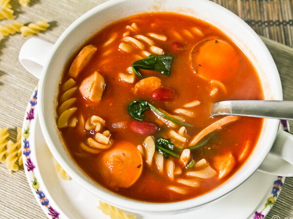 - Положите жареные сосиски и фасоль в суп. Как следует все перемешайте, нагрейте. Добавьте в суп макароны и шпинат. Перемешайте и вновь нагреете. Подавайте суп горячим, с хлебом и пармезаном (по желанию).