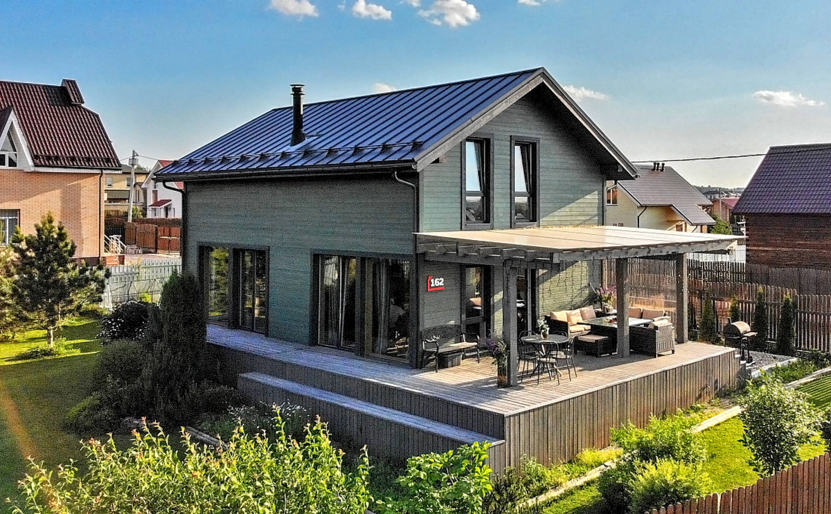 Уютный загородный дом, о котором пойдет речь, имеет лаконичный дизайн. Здесь нет сложных архитектурных элементов или вычурной, кричащей отделки. Глядя на этот небольшой (126 м²) каркасный дом, трудно поверить, что в нем слились самые прогрессивные строительные технологии и высокотехнологичные материалы. Итак, давайте откроем эту «шкатулку с секретами».