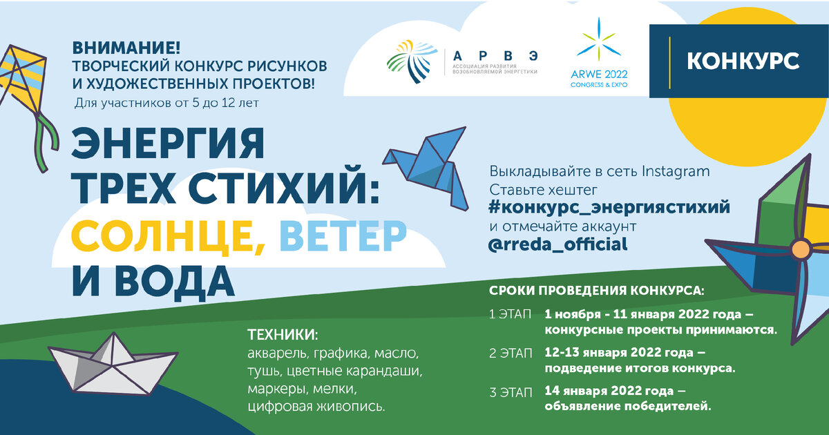 Завершается прием работ на детский творческий Конкурс. Нарисовать солнечную панель, ветрогенератор или гидроэлектростанцию, получить признание пользователей Instagramсо всей страны и приз от Ассоциации развития возобновляемой энергетики – все это возможно, если успеть принять участие в творческом конкурсе «Энергия трех стихий: солнце, ветер и вода». Прием работ завершится в конце дня 11 января. Конкурс проходит в рамках подготовки к большому событию – к Международному Форуму «Возобновляемая энергетика» (ARWE-2022), который состоится в мае 2022 года в Ростове-на -Дону. Условия конкурса в Instagram просты: автору должно быть от 5 до 12 лет. Техника исполнения может быть любой – акварель, графика, масло, тушь, цветные карандаши, маркеры, мелки, цифровая живопись. Идея рисунка – роль возобновляемой энергетики, которая позволяет снижать выбросы парниковых газов в атмосферу, в энергопереходе. Главное – до завершения приема работ успеть разместить работу на своей странице в Instagram, добавив