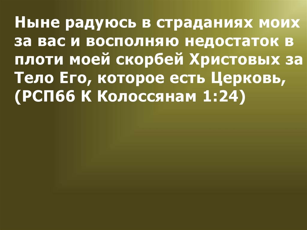 «Ныне радуюсь в страданиях моих за вас и восполняю недостаток в плоти моей скорбей Христовых за тело Его, которое есть Церковь» (Кол. 1:24).