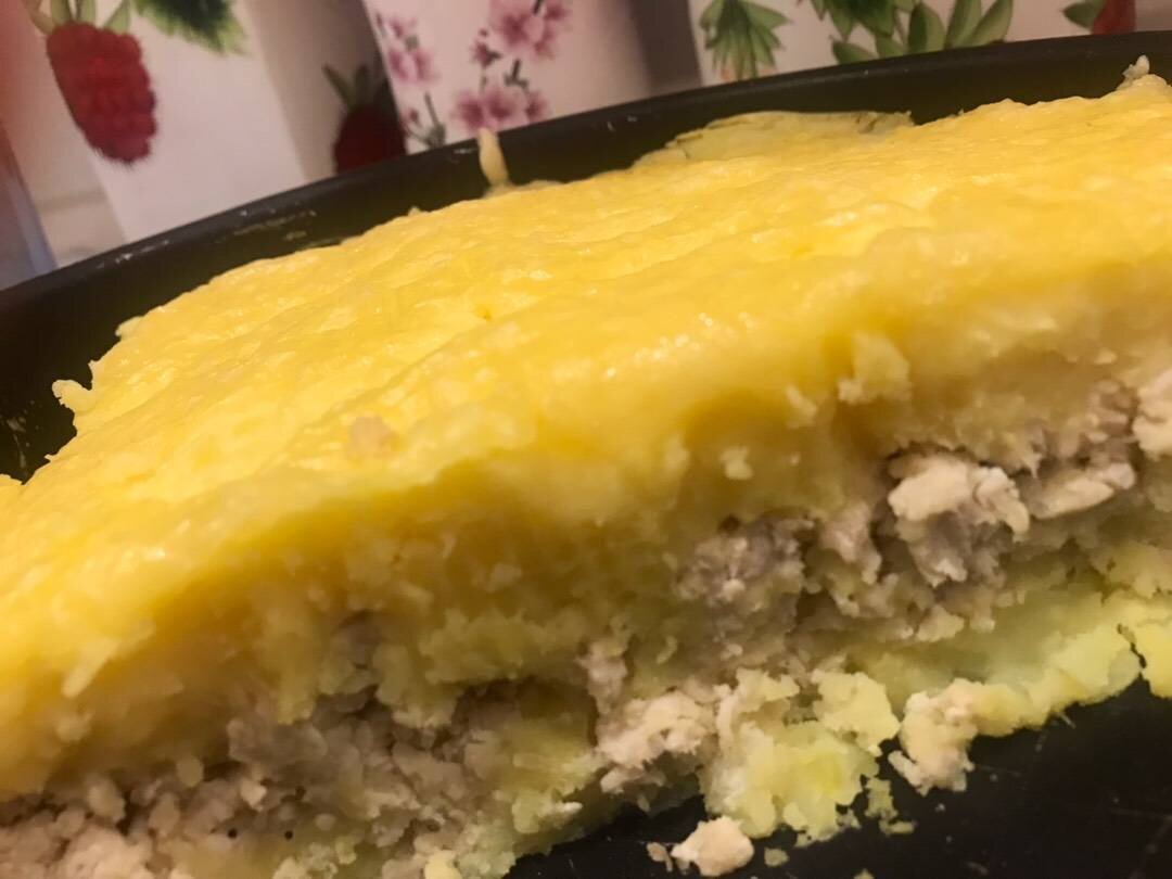 Ингредиенты: картофеля, куриного фарша, луковица, яйцо, твёрдого сыра, сливочного масла, Соль Способ приготовления: Отварить картофель, добавить сливочное масло и яйцо, сделать пюре. Мелко нарезанный лук обжариваем на небольшом количестве растительного масла до золотистости. Добавляем фарш и жарим минут 7, до готовности. За несколько минут до готовности солим, перчим и добавляем любимые специи. В форму для запекания выкладываем половину пюре, разравниваем. На картофель распределяем фарш. Закрываем фарш оставшейся половиной картофеля. Разравниваем. Присыпаем запеканку сверху натёртым на крупной тёрке сыром. Готовим картофельную запеканку с фаршем и сыром в духовке при 180 ° С минут двадцать.