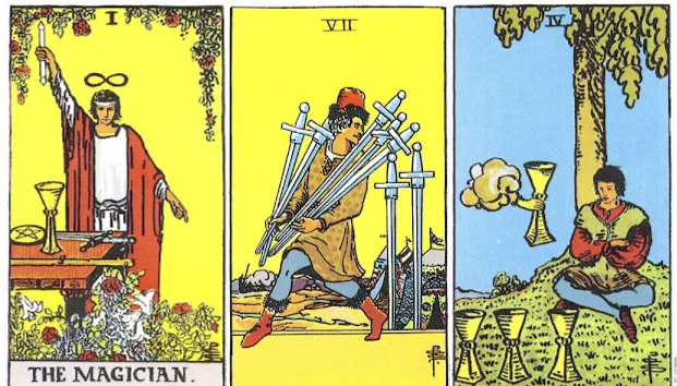 Здравствуйте! В этой статье я предложила Вам поразмышлять на тему триплета такая вот у нас там картинка была. Расскажу свои предположения и как оно вышло в реальности. Маг и две не совсем уж радужные карты. Хотя на семерке мечей вроде как желтый цвет, созвучен с фоном Мага, но это как раз в нашем случае говорит о том, что семерка идет как продолжение Мага, как раскрытие его истинной сущности. Да, мальчик... как это сказать, урывает свое, если есть такое выражение. Тут на карте хитрец средь бела дня украл мечи, тихонько вытащил и на цыпочках уносит их. То есть он открыто и не таясь, но применяя простые ухищрения, берет то, что ему надо. Не скрываясь под покровом ночи, не придумывая хитроумные схемы, просто берет пока все спят. Ну или где они там, бойцы. Четверка кубков это про перенасыщение, про то, что уже дурно от тех благ, которые предлагаются. Про то, что раньше все это было весело, приятно, хорошо (по тройке кубков), а сейчас уже и в горло не лезет. Мой вердикт был такой: мальчик,
