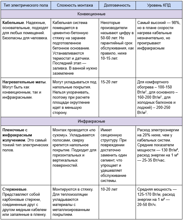 в помещение и предотвращают вероятность затопления соседей (такой риск есть при использовании водных систем). Состоят из нагревательных элементов, терморегулятора и монтажных приспособлений (гофрированные трубы, крепежная лента и другие детали). В зависимости от вида нагревательных элементов электрические полы делятся н