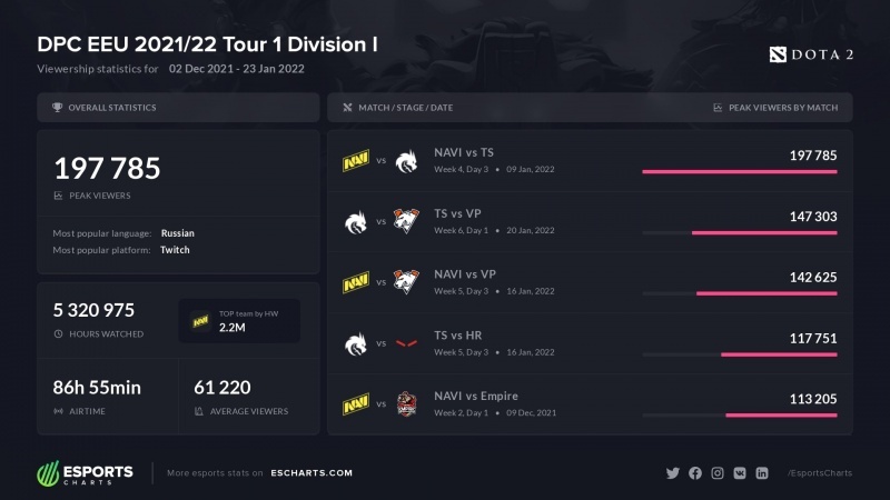 Портал Esports Charts поделился статистикой касательно просмотров матчей DPC EEU 2021/22 Tour 1: Дивизион I. В топ-5 самых популярных среди зрителей матчей вошли три серии с участием Natus Vincere и три серии с участием Team Spirit. Самой популярной серией в рамках первого дивизиона DPC-лиги Восточной Европы стало противостояние Украина Natus Vincere и Россия Team Spirit, завершившееся победой «драконов» со счётом 2:1. В пике за данным матчем следили практически 200 000 зрителей. Далее расположились противостояния участников самой популярной серии против Россия Virtus.pro, набравшие более 140 000 человек на трансляциях. Топ-5 замыкают также матчи с участие «драконов» и «рождённых побеждать». Четвёртое место досталось серии Россия Team Spirit — Россия HellRaisers, а пятое — матчу Украина Natus Vincere против Украина Team Empire, в рамках которого коллективу Украина Андрея 'Ghostik' Кадыка удалось победить на первой карте серии.