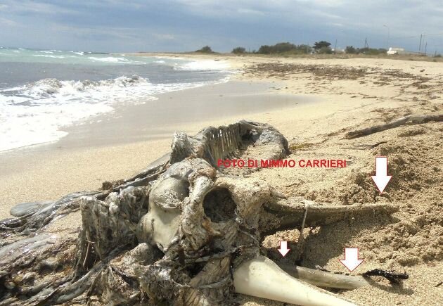 На береговой линии Пальминтелло в муниципалитете Марина-ди-Лиццано (Таранто) в Саленто был найден скелет морского животного, принадлежащего к какому-то странному неопределимому виду. Фотожурналист Миммо Карриери рассказал: «За все эти годы мне случалось видеть морских черепах, дельфинов и китов, но никогда прежде я не видел ничего подобного». Животное имело длину около 150 сантиметров, обхват тела не удалось определить, так как оно находилось в состоянии разложения (но примерно 70–80 см). То, что делает этот вид «чужеродным», - это форма черепа, очень похожая на человеческую, огромные экзокраниальные полости с одним видимым глазным яблоком, три клыка или рога длиной 30–40 сантиметров, и хвост, очень похожий на крокодилий. О находке было уведомлено полицейское управление муниципалитета Лиццано, которое вызвало специализированную фирму для удаления и утилизации туши на разрешенной свалке. К сожалению, мнение экспертов, которые бы осмотрели тушу и установили видовую принадлежности этого «