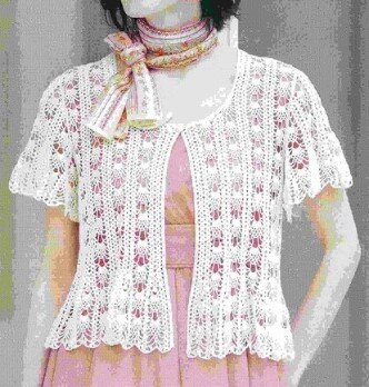 Хрустальная капель потоков белых ананасов - в этом жакетике романтично все! И летящие рукава и линия низа, и беззащитный цвет, и изящный вырез... Очень женственная модель.