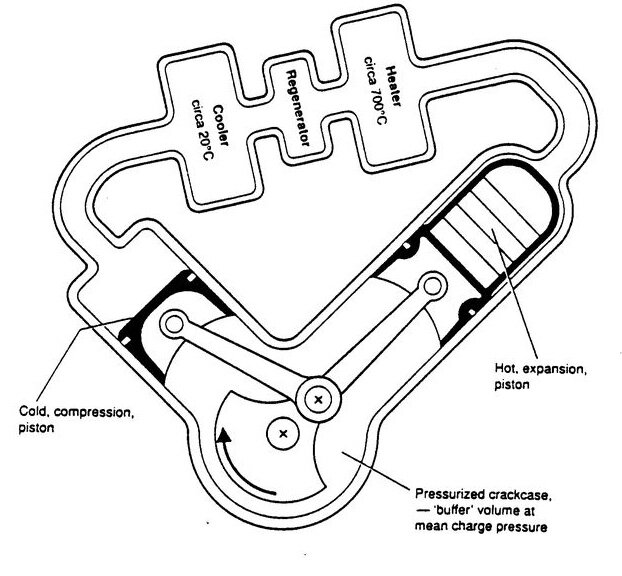 На малую удельную мощность двигателя Стирлинга играет еще то, что его трудно форсировать по оборотам. Обычно двигатель Стирлинга работает под нагрузкой на оборотах в 500-700 оборотах. Выше обороты сложно развить по самой схеме необходимости перемещения рабочего тела между цилиндрами двигателя. Кроме того очень непросто устроить высокий теплоперепад между холодной и горячей зоной, которые должны находится на небольшом расстоянии друг от друга. А именно высокий теплоперепад между этими зонами и есть залог и КПД и мощности двигателя.
