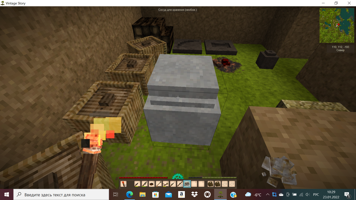 За шесть предыдущих частей: я 2 раза не пережил встречи с волками, нашёл стоянку и построил домик из земли. Через некоторое время у меня закончились дрова, а снаружи были волки. Пришлось мне делать короткие вылазки-перебежки. Со временем я научился управляться с копьём. Я отправился в небольшое путешествие за глиной, и после десятка "подарков" от дрифтеров, добыл её, и сделал и из неё глиняную посуду, которую пришлось обжигать. Обжигая её, я чуть не устроил пожар... Я хотел перейти в медный век, и пытался расплавить медь в тигле на дровах, но у них была слишком маленькая температура. И пришлось мне делать угольную яму, и пережигать в ней дрова в уголь. Оставив уголь готовиться, я отправился в путешествие. Вышел на поля, нашёл там лён, полбу, огнеупорную глину и руины. Переждал там ночь и вернулся домой. Намыл себе ещё меди, и сделал себе два первых инструмента: кирку и молот. Теперь я мог добывать медь в виде руды, что я сделал. Также я расширил двор, и дом, развёл огород, и построил подвал, куда теперь сложил еду...