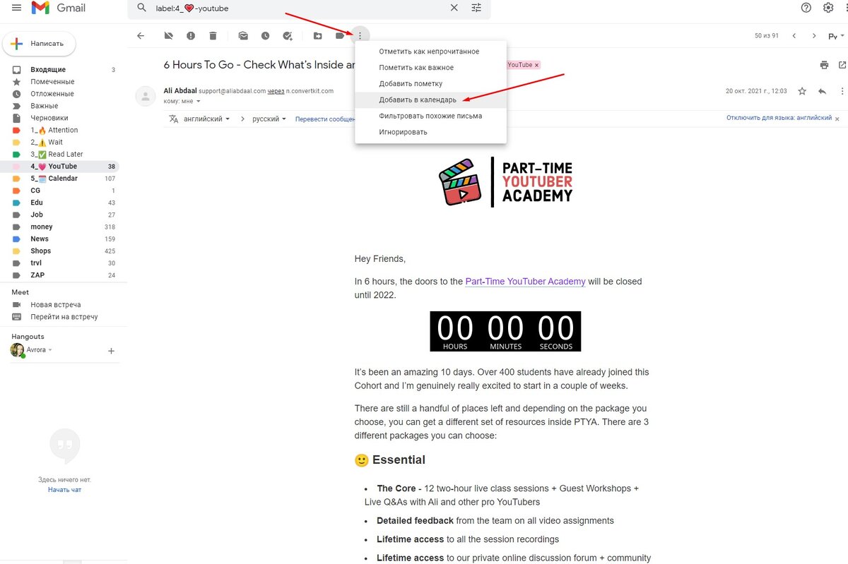 В этой статье я расскажу как из почтового ящика гугл gmail сохранить мероприятие, потому что это гораздо проще чем вы думаете и это очень экономит ваше время. Вы также можете посмотреть мое новое видео на канале на эту тему где я подробно показываю как это сделать, посмотрите обязательно!! Как добавить письма gmail в google calendar? Открываем сообщение, после этого в выпадающем списке выбираем - Добавить в календарь. Далее в открывшемся окне создается новое мероприятие и можно вносить в мероприятие любые изменения. Более подробно смотрите здесь: https://studio.youtube.com/video/UU5TrsVTa6E/edit Наименование мероприятия может быть изменено, а также все что с ним связано, а именно: 1. Настроить дата проведения мероприятия и диапазон время его проведения. 2. Настроить повторение мероприятия в случае необходимости. Можно повторять через неделю, месяц, год, каждый будний день, ... но если выбрать Другое... то можно изменять - Интервал повторений, Дни повторения и даже Окончание 3. Настро