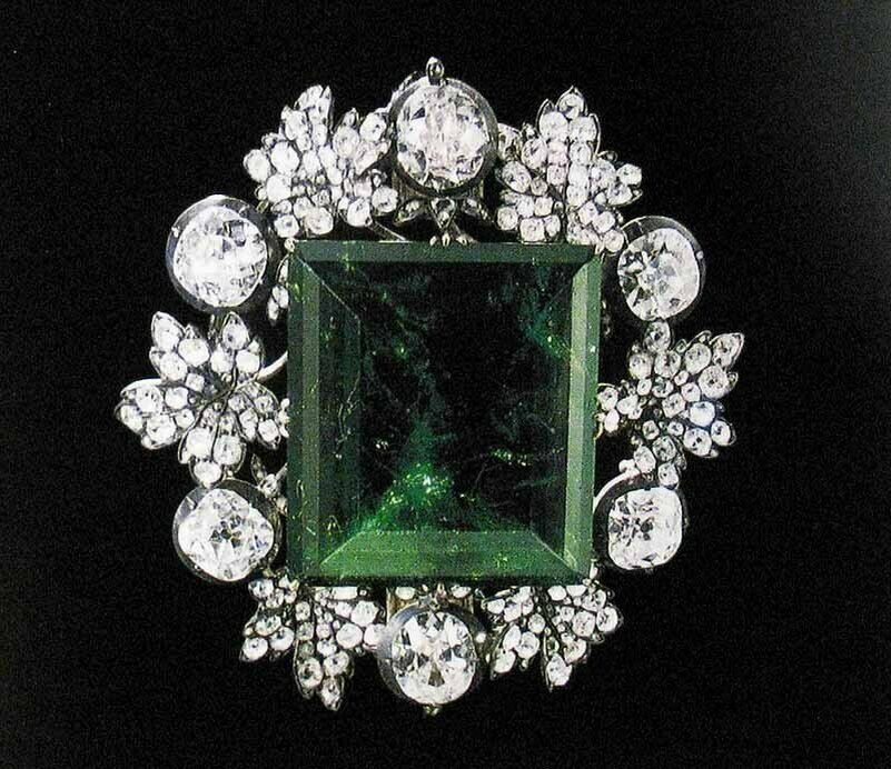 Среди бесценных сокровищ Алмазного фонда России особо выделяется своей красотой и изяществом брошь с огромным изумрудом, получившим название «Зеленая королева». Происхождение «Зелёной королевы» окутано тайной. Известно лишь, что найден он был в XVI или XVII веке в далёкой Колумбии. Согласно одной из легенд, изумруд хранился в одном из языческих храмов, откуда был вывезен конкистадорами в Европу. По мнению выдающегося советского минералога академика Александра Ферсмана, этот камень является единственным в своём роде: при больших размерах он абсолютно чист и прозрачен. А это главный критерий качества. Идеальный изумруд — прозрачный камень равномерно распределённого насыщенного цвета. Крупные бездефектные изумруды густого тона весом от пяти карат ценятся дороже алмазов. Именно таким и был изумруд «Зелёная королева». Его глубокий цвет приятно успокаивает глаз. Достоверно неизвестно, когда и кем был обработан этот изумруд. Он получил ступенчатую огранку и стал весить 136,25 карата. «Зелёную