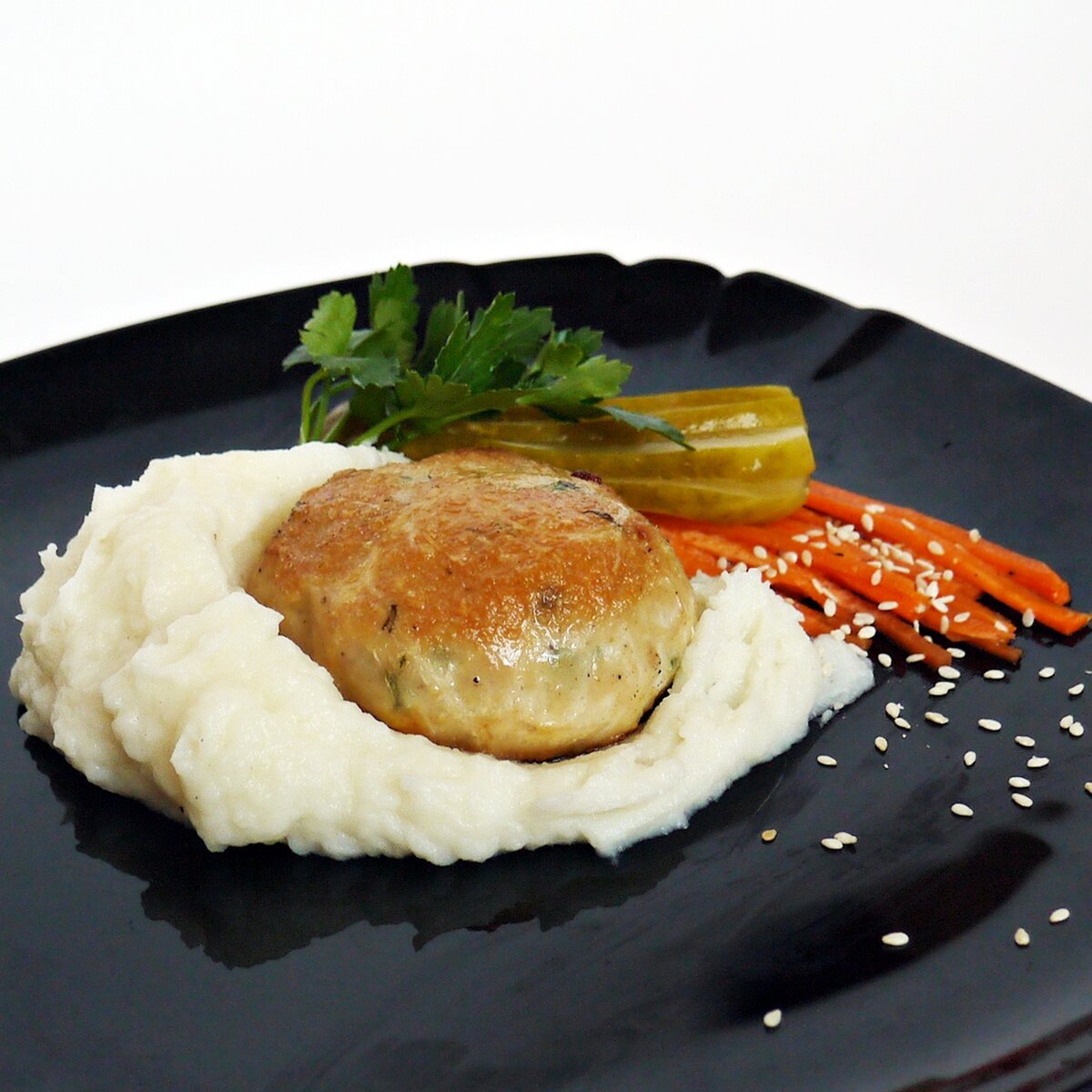 - Да как можно котлеты и без пюре?! - Возмутились домашние. Мой ленивый план отварить рис потерпел крах и посыпался, как тетрис на максималках - опять не вышло, но попробовать стоило... Котлетки поставляются замороженные, в вакуумной упаковке по 4 штучки - оптимально, особенно если продукт не знаком. Размораживать лучше грамотно, с вечера переложив упаковку из морозильника в холодильник. Сами котлетки, даже сырые, привлекают внимание тем, что заботливо обёрнуты в натуральную плёнку и не требуют панировки. Такой ход заботливых фермеров раззадорил на приготовление крем-пюре из раннего картофеля со сливками и сливочным маслом. Вдохновил на морковный с кунжутом салат и любительский карвинг маринованного огурца. А зелень петрушки сама собой разумеется. Поджарил на сливочном масле до красивой корочки и довёл до готовности уже в духовке на очень слабом огне. Славно получилось, а как пошли ароматы мяса и картофеля, домашние стали наведываться на кухню и с любопытством мониторить процесс.