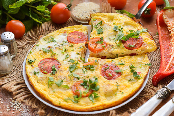 Предлагаем вам рецепт итальянского омлета который называется фриттата. Готовить его очень просто. Подробный рецепт с пошаговыми фото вы найдете на нашем сайте: Фриттата классический рецепт Источник: https://kopilka-kulinara.ru/eggs/yaichnitsa/frittata-klassicheskij-reczept-s-poshagovymi-foto/